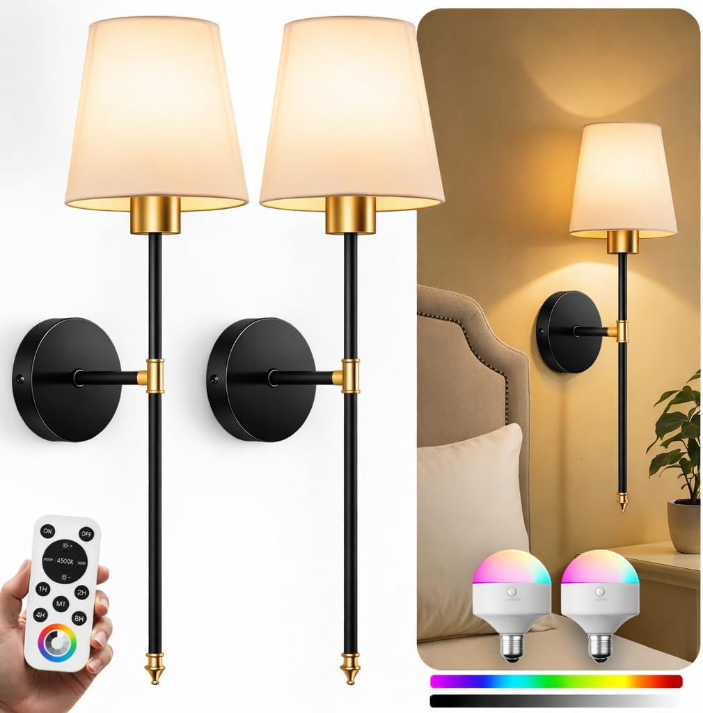 | Included Components | 2 x Charging Cable, 2 x Metal Lamp Holders & 2 x White Fabric Lampshades, 2 x RGB Bulbs & 2 x Remote Control, Instruction Manual, Mounting Hardware |